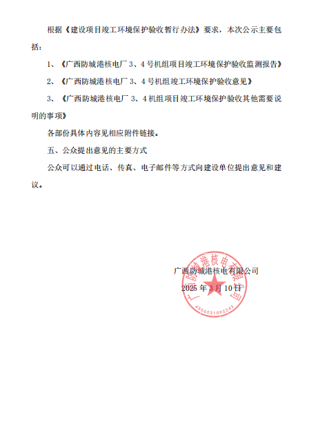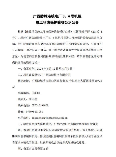 廣西防城港核電廠3、4機(jī)組竣工項(xiàng)目環(huán)境保護(hù)驗(yàn)收公示公告