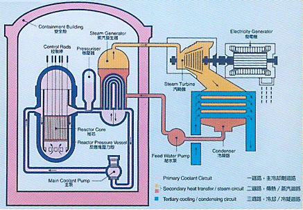 1.反應堆堆芯內(nèi)進行核裂變并穩(wěn)定地釋放熱能。由于采用穩(wěn)壓器提高系統(tǒng)內(nèi)的水壓,一回路的水受熱后不會沸騰。這些高壓水隨之將堆芯內(nèi)產(chǎn)生的熱能帶走。 2.帶熱能的高壓水經(jīng)蒸汽發(fā)生器內(nèi)數(shù)以千計的傳熱管,將熱能傳到管外二回路系統(tǒng)的水內(nèi)。二回路系統(tǒng)與一回路系統(tǒng)是完全分隔的。